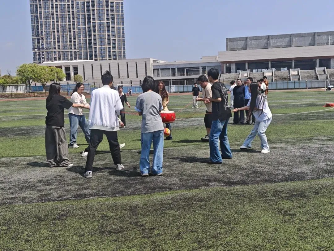 “钨金战鼓”项目堪称全场最具节奏感的挑战!几名同学手牵绳索,共同控制一面红鼓,配合着将鼓上的排球连续颠起。这正如稀土加工中“精准控制、协同操作”的工序,需要所有人节奏统一、力度均衡,才能让排球在鼓上平稳跳跃。大家眼神紧盯排球,双手随着节奏拉动绳索,每一次颠球的成功都伴随着集体的欢呼,失误时也会互相打气,在一次次磨合中找到团队的节奏。