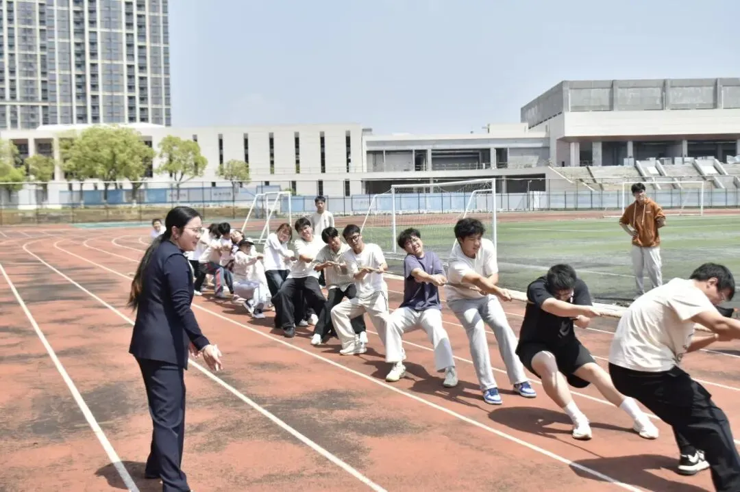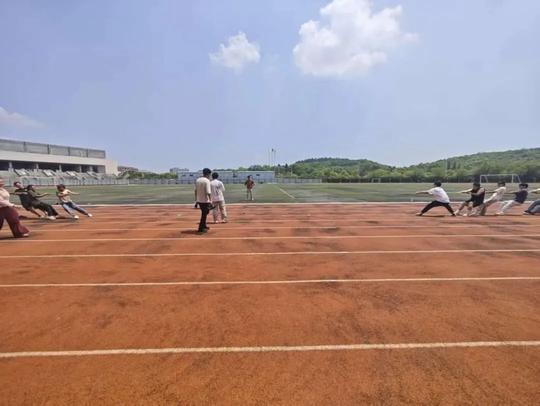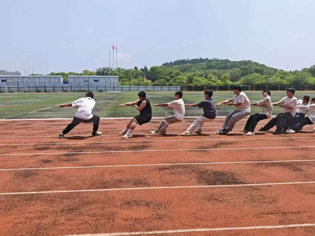 最受瞩目的“稀土争锋”项目,正是经典的拔河比赛!双方队员紧握绳索,身体后倾,拼尽全力向后拉拽,正如稀土提取中“攻坚克难、奋力突破”的专业精神。绳子中间的红线在两队之间来回移动,同学们咬紧牙关,喊着整齐的号子。每一次坚持,都是对团队力量的最好诠释;每一次发力,都展现着学子们不服输的韧劲。
