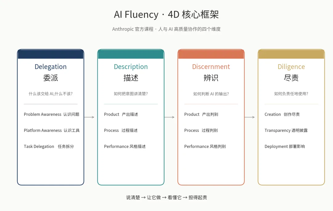 先判断什么该交给 AI(Delegation)→ 把意图清晰地说出来(Description)→ 批判性地检查产出(Discernment)→ 对最终结果担起责任(Diligence)。