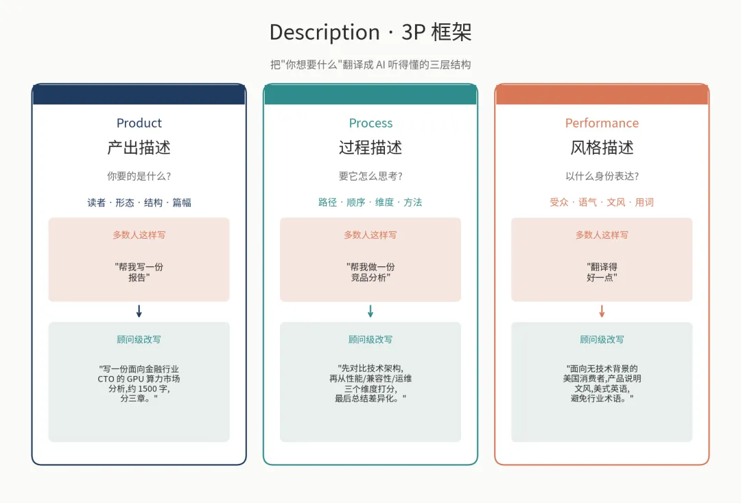 决定好交给 AI 之后,下一步是 Description——怎么把你的意图讲清楚。这一层有个极其好用的方法论叫 3P 框架:Product(产出)、Process(过程)、Performance(风格)。