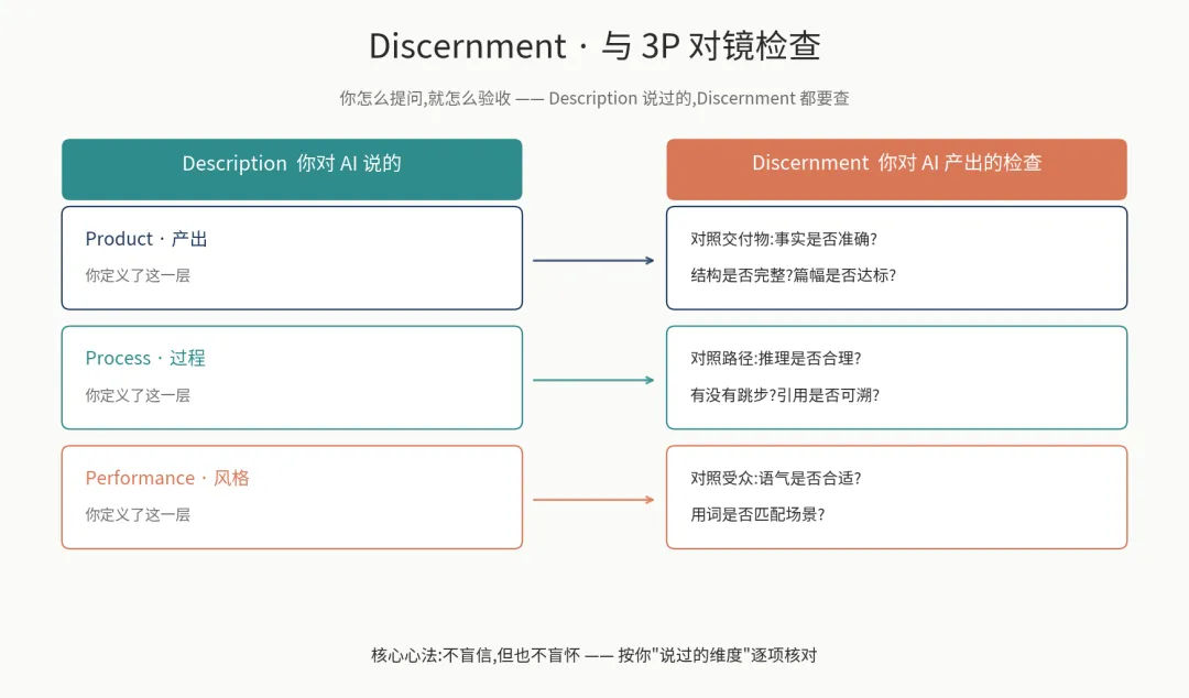 这是最被低估的一层。大多数人写完提示词、看到输出就直接复制走——问题是,AI 会一本正经地胡说八道。Discernment 就是那层"验收过滤"。