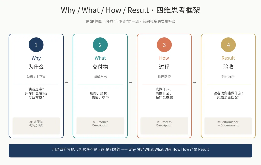 这四步的顺序不是可选的,是刻意的:Why 决定 What,What 约束 How,How 产出 Result。上游没定,下游必漂。