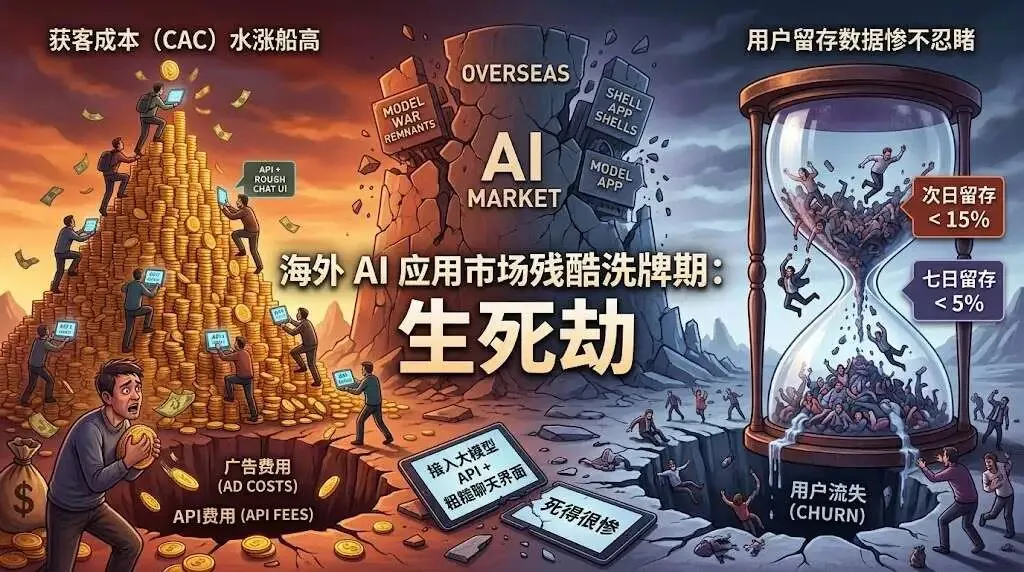 在经历过“百模大战”与套壳应用的野蛮生长后,海外 AI 应用市场已经步入了一个极其残酷的洗牌期。传统的出海开发者如果还在试图靠着一个简单的“接入大模型 API + 粗糙的聊天界面”去海外大盘捞金,大概率会死得很惨。如今的 AI 产品面临着一个共同的生死劫:获客成本水涨船高,但用户留存数据却惨不忍睹,很多产品的次日留存不到 15%,七日留存更是直接跌破 5%。