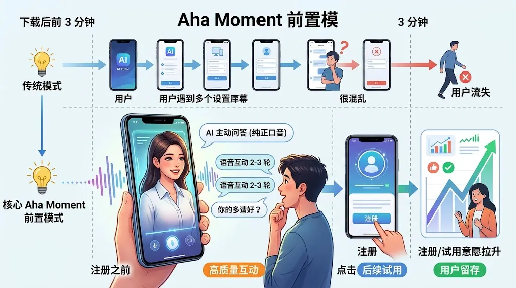 如果用户在下载后的前 3 分钟内没有感受到 AI 带来的震撼,他们就会流失。AI Tutor 产品往往在引导页就直接安排一个极具吸引力的 AI 角色主动用纯正的口音向用户发问,产生 2-3 轮高质量的语音互动。这种“核心 Aha Moment 前置”策略,极大地拉升了用户注册和后续试用的意愿。