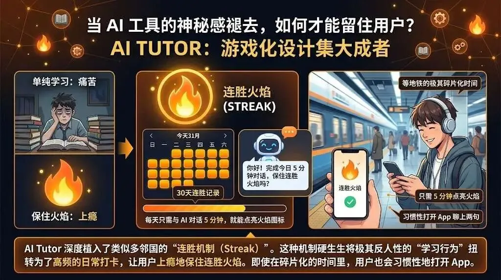 单纯的学习是痛苦的,但保住“连胜火焰”是上瘾的。AI Tutor 深度植入了类似多邻国的“连胜机制 (Streak)”。每天只需与 AI 对话 5 分钟,就能点亮当天的火焰图标。为了不让连续 30 天的记录断掉,用户即使在等地铁的极其碎片化的时间里,也会习惯性地打开 App 聊上两句。这种机制硬生生将极其反人性的“学习行为”扭转为了高频的日常打卡。