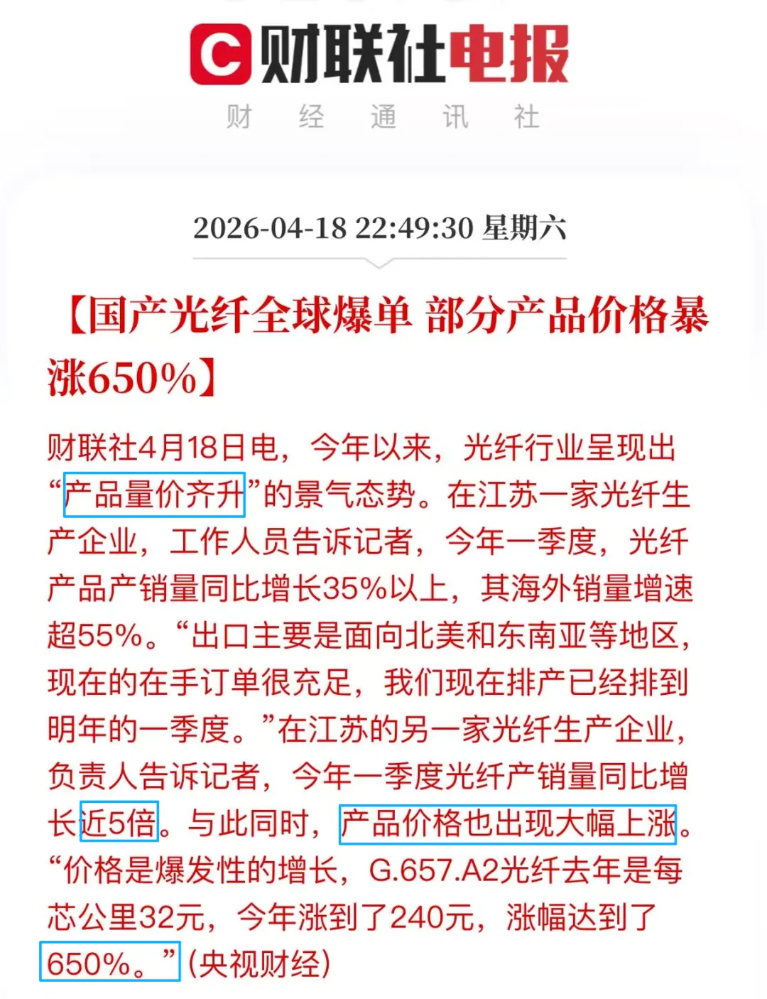 财联社4月18日电,今年以来,光纤行业呈现出"产品量价齐升"的景气态势。在江苏一家光纤生产企业,工作人员告诉记者,今年一季度,光纤产品产销量同比增长35%以上,其海外销量增速超55%。"出口主要是面向北美和东南亚等地区,现在的在手订单很充足,我们现在排产已经排到明年的一季度。"在江苏的另一家光纤生产企业,负责人告诉记者,今年一季度光纤产销量同比增长近5倍。与此同时,产品价格也出现大幅上涨。"价格是爆发性的增长,G.657.A2光纤去年是每芯公里32元,今年涨到了240元,涨幅达到了650%。"(央视财经)这则刷屏头条,正是全球光纤行业超级景气周期的最直观写照。一根比头发丝还细的玻璃丝,正是这场“爆单潮”的核心主角——光纤。它不仅是现代数字世界的“数据高速公路”,更是AI算力爆发时代的核心支撑。过去20年,它默默撑起了5G、宽带与云计算的发展;如今,AI大模型狂飙突进,让光纤正式站上舞台中央,成为AI算力网络的“神经系统”。光缆行业(光纤光缆行业)的底层逻辑,本质上就是这一“数字基础设施的神经系统”,其核心在于光信号全内反射传输机制带来的高带宽、低损耗、抗干扰特性,支撑全球数据爆炸式增长。不同于传统周期品,这是一个由技术壁垒驱动、供需结构性错配的赛道,目前正从“电信周期品”向“AI算力基建资源品”转型,这也是2025-2026年全球光纤行业迎来史诗级超级景气周期的核心背景。供需严重错配之下,除G.657.A2光纤涨幅达650%外,G.652D单模光纤现货价格也从底部18元/芯公里暴涨至85-120元/芯公里,高端G.654.E涨幅同样迅猛,中国“光纤四杰”迎来量价齐升的戴维斯双击,成为A股最具确定性的投资机会之一。本文从光纤基础概念讲起,层层拆解:为什么光缆远优于铜缆?AI时代光纤的新使命是什么?产业链谁在赚大钱?技术迭代往哪走?最后落地到A股四杰的深度对比与投资建议,逻辑清晰、通俗易懂,既有细节支撑,又有实战导向,让你真正看懂这波AI算力催生的光纤红利。光纤,全称光导纤维,是用高纯度石英玻璃(二氧化硅)制成的极细纤维,直径仅0.125毫米——比普通头发丝还要细一圈。光线以合适角度进入光纤芯部(高折射率)后,会在芯层与包层(低折射率)的界面发生“全内反射”,如同光线在密闭的镜面通道内不断反弹,被牢牢“囚禁”在光纤内部向前传播,几乎不向外泄漏,也完全不受外界电磁干扰。这一核心机制,是光缆行业底层逻辑的技术根基,决定了光纤高带宽、低损耗、抗干扰的核心优势,支撑着全球数据的爆炸式增长。- 带宽极高:一根光纤可同时传输上百个波长的光信号,理论容量远超铜缆,可轻松支撑800G、1.6T甚至更高速率(其中800G是当前光模块的主流配置,1.6T是下一代光模块的核心配置),完美匹配AI集群的海量数据吞吐需求。