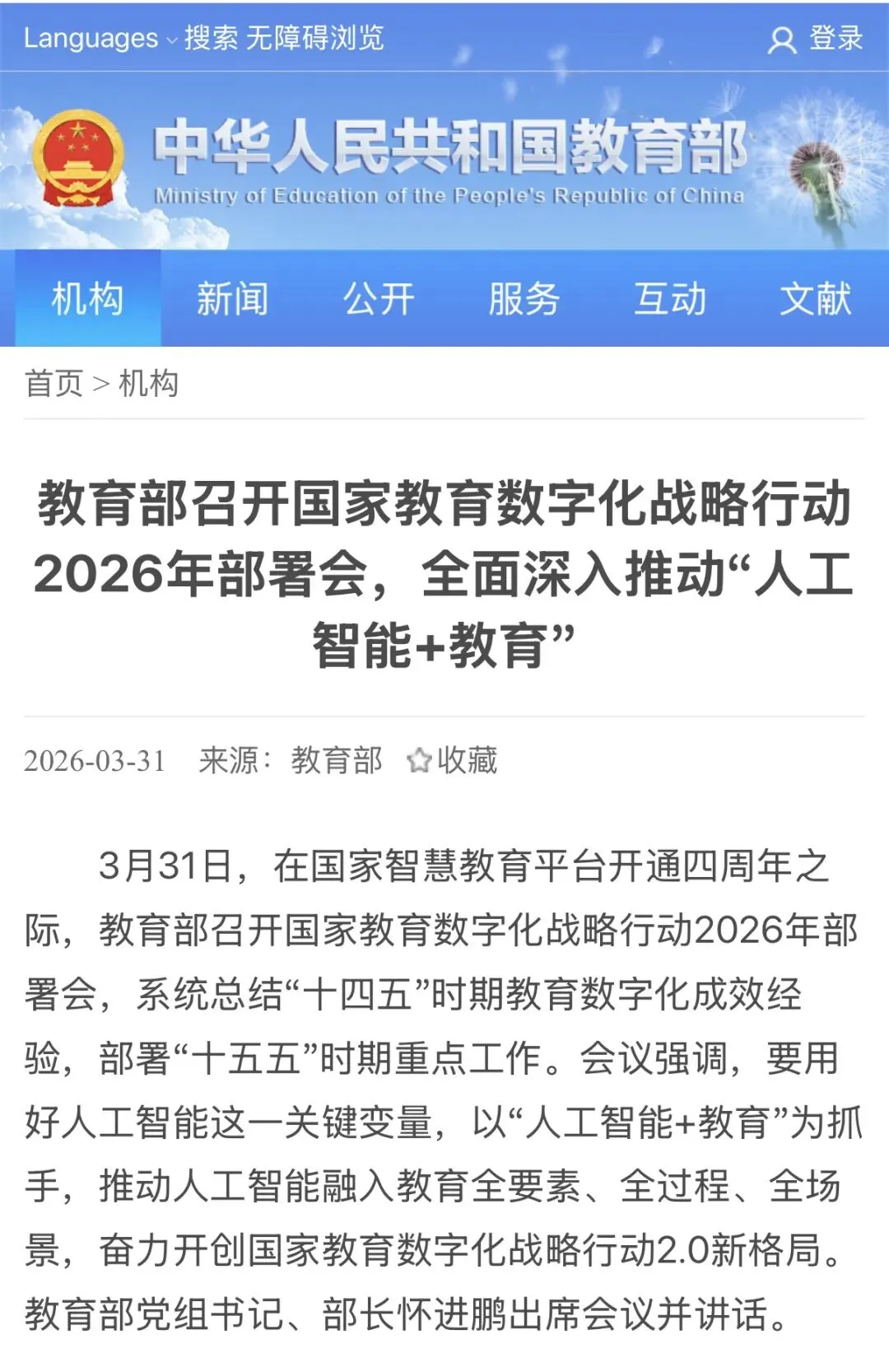 2026年4月,教育部等五部门联合发布了一份重磅文件——《“人工智能+教育”行动计划》,发文字号是“教科信〔2026〕1号”。文件明确提出:人工智能要成为中小学的必修课,大学要开设AI公共基础课,职业教育也要全面智能化升级。