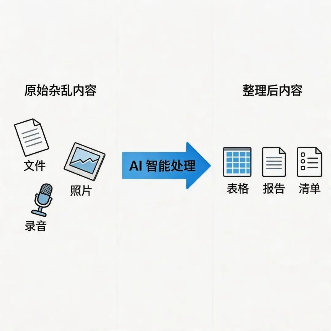 • 一段 3 小时的会议录音 → AI 5 分钟整理成结构化纪要 • 一张焊接缺陷的照片 → AI 分析出 4 类可能原因 • 50 张发票 → AI 一次性读取并生成 Excel 表格 • 客户的朋友圈截图 → AI 分析出价值观和爱好