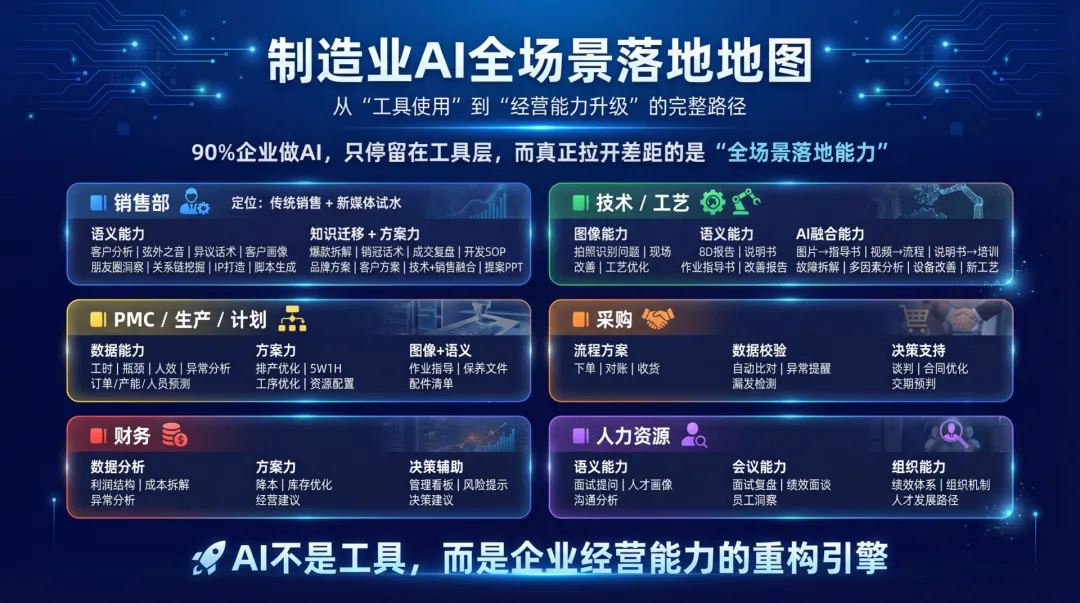 • 生产部用 AI 分析焊接泄漏问题,3 分钟给出 4 个排查方向 • 销售部用朋友圈截图做客户分析,找到 80% 的增量空间 • 技术部用 6 张照片生成作业指导书,过去要写 2 天,现在 20 分钟