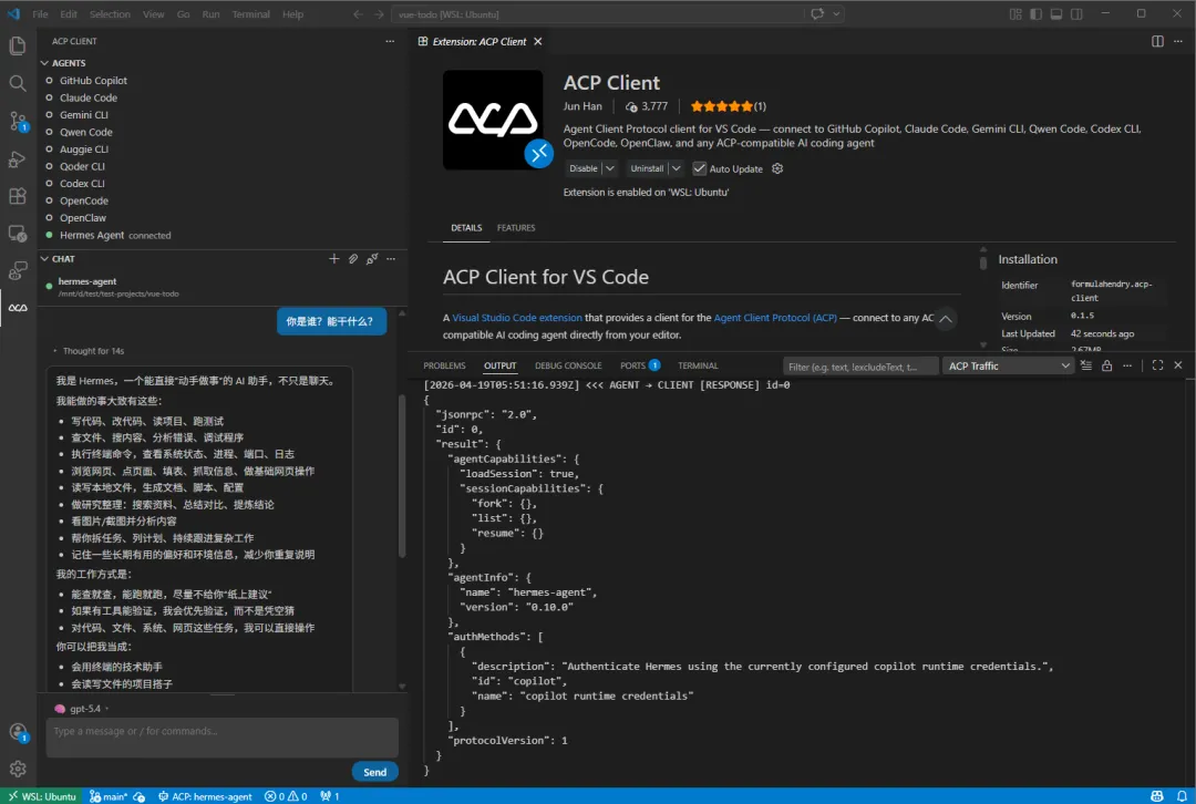 于是,今天趁着周末,我就发布了 v0.1.5 版本的 ACP Client for VS Code,正式添加了对 Hermes Agent 的支持!