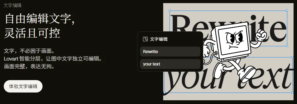 所见即所得的修改:它的Text Edit功能,让你修改图片上的文字就像在Word文档里打字一样简单。无论是艺术字还是特效字,修改后风格完全保留,彻底告别了在PS里一点点抠图的烦恼。