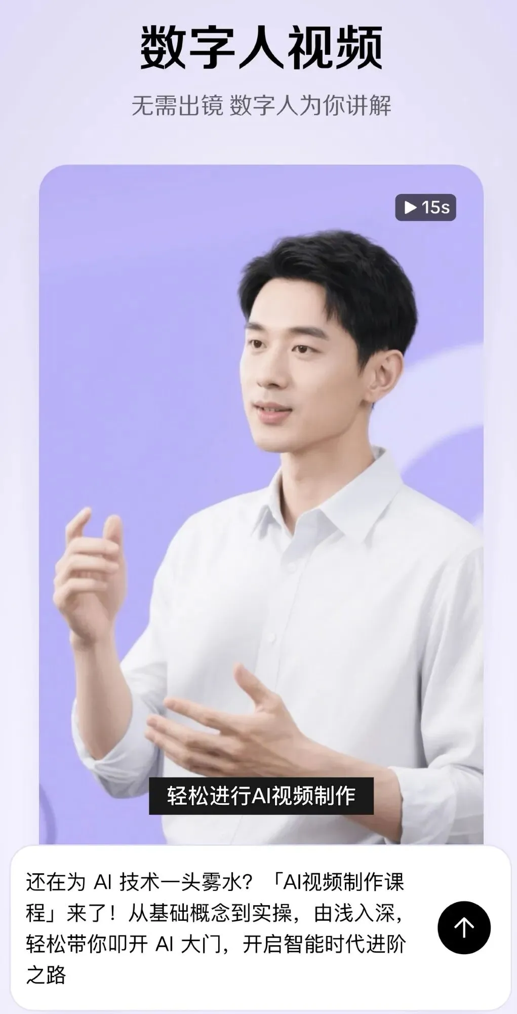 需要注意的是小云雀生成的视频“AI味”还比较重,在镜头语言、转场节奏上可能存在趋同化的问题。在作品集的应用上更适合展示动态设计、短视频创意、视觉叙事等。比如,你可以生成一个“虚拟策展人”来介绍你的作品集,或者为你的设计项目制作多语言的讲解视频。