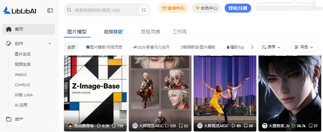 LiblibAI, 其核心功能是强大的AI绘画平台,拥有10万+模型库,涵盖多种风格,支持文生图、图生图、自定义LORA模型训练。提供图片生成、视频生成、视频特效和资产等功能模块。