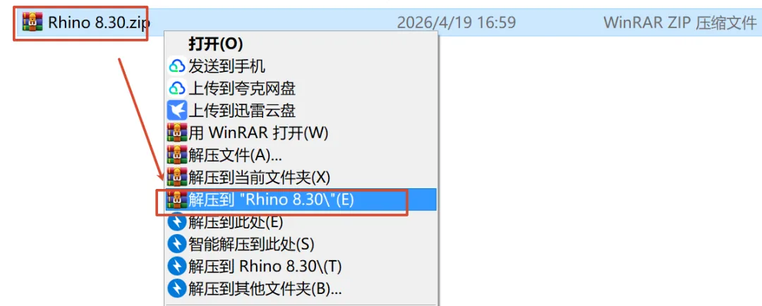 1.选中下载的压缩包,右键解压到“Rhino 8.30”文件夹