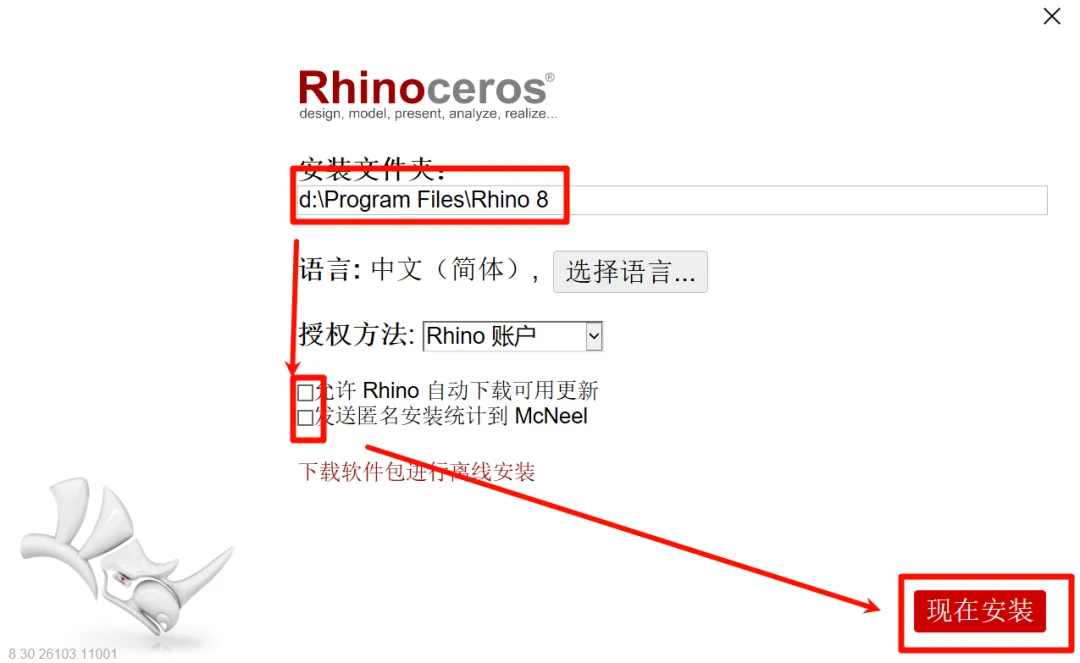4.选择安装路径,取消勾选“允许Rhino自动下载可用更新”和“发送匿名安装统计...”,点击“现在安装”(建议和我的安装路径保持一致)