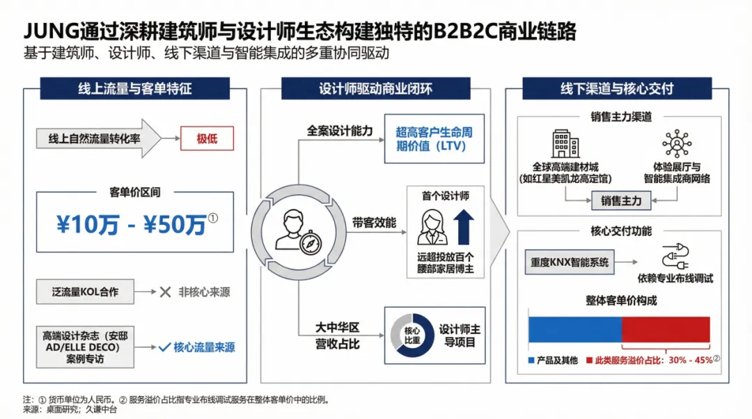 永诺几乎不做大众市场的广告投放,其线上店铺的自然流量转化率极低。但它的客单价却能稳定在10万元至50万元人民币的区间。高客单价的秘密,在于永诺建立了一套深度绑定建筑师与室内设计师的B2B2C销售模式。