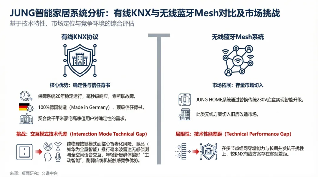 为了拓展存量房市场,永诺也推出了名为JUNG HOME的蓝牙Mesh无线系统。该方案无需重新布线,只需替换传统的230V开关底盒即可实现智能化。但这是一种技术上的妥协。在多设备组网的穿墙能力、长期高并发使用的抗干扰性上,无线方案与KNX有线方案相比,存在着客观的技术差距。