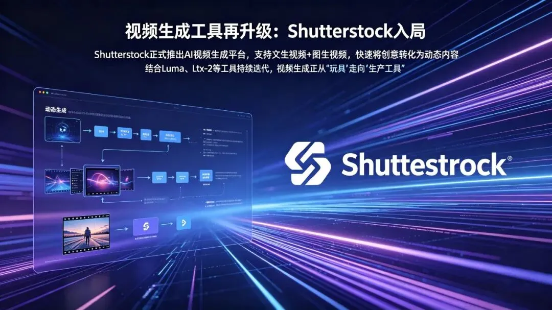 Shutterstock正式推出AI视频生成平台,支持文生视频+图生视频,可快速将创意转化为动态内容。结合此前Luma、Ltx-2等工具的持续迭代,视频生成正从“玩具”走向“生产工具”。
