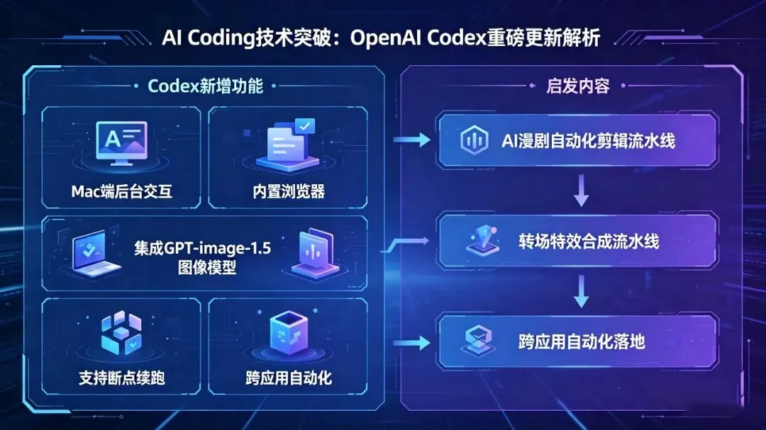 Codex新增Mac端后台交互、内置浏览器、集成GPT-image-1.5图像模型,支持断点续跑和跨应用自动化。这意味着AI驱动的内容生产管线正在成熟。