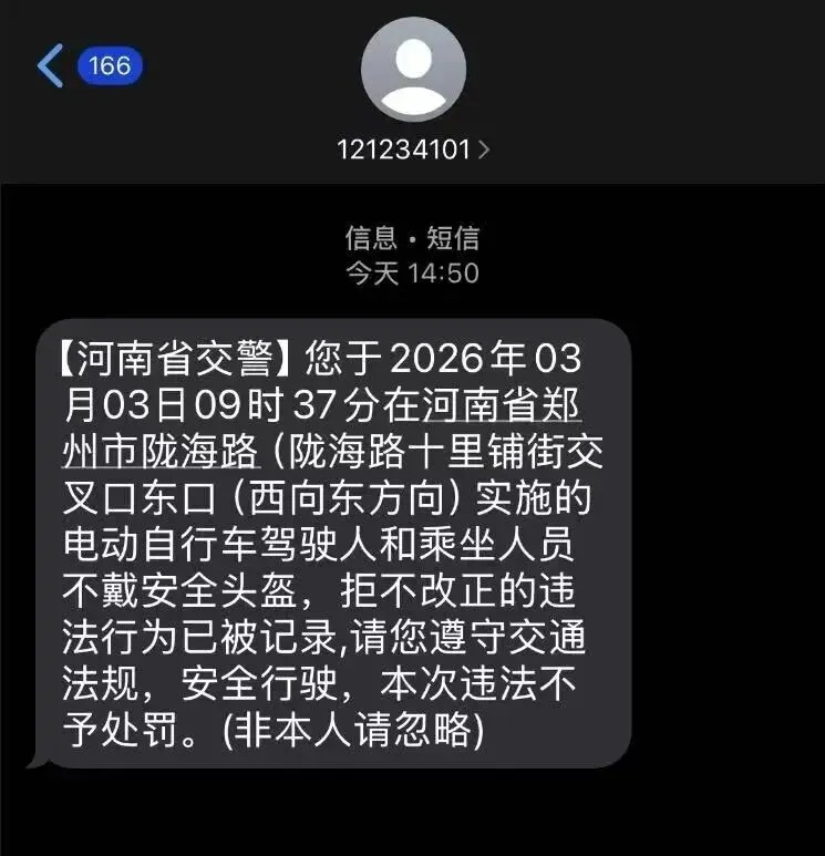 同时,系统通过人脸识别比对锁定当事人,自动留存证据,并通过“河南交警”短信精准推送违法告知,列明违法事实、法律依据和处理地点,引导当事人主动接受处理。