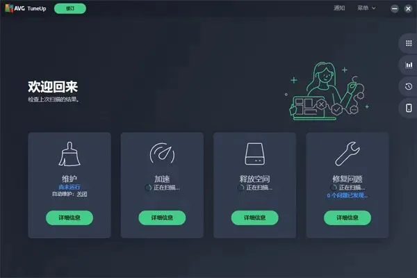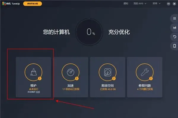 1、首先打开AVG TuneUp软件,主要提供了维护、加速、释放空间、修复问题;