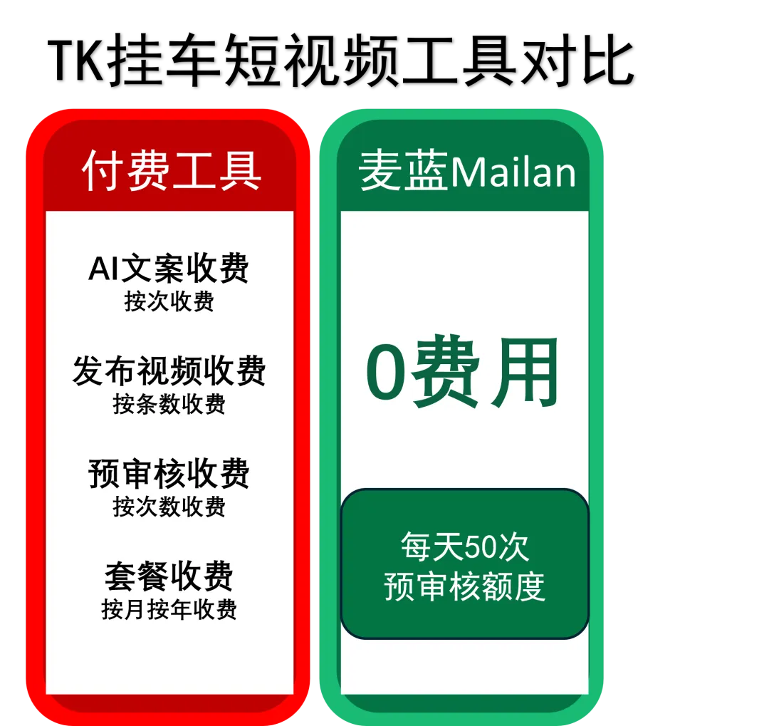 本次免费版的核心权益是:通过麦蓝AI平台,使用TikTok官方API接口,发布挂车带货短视频,完全0费用。