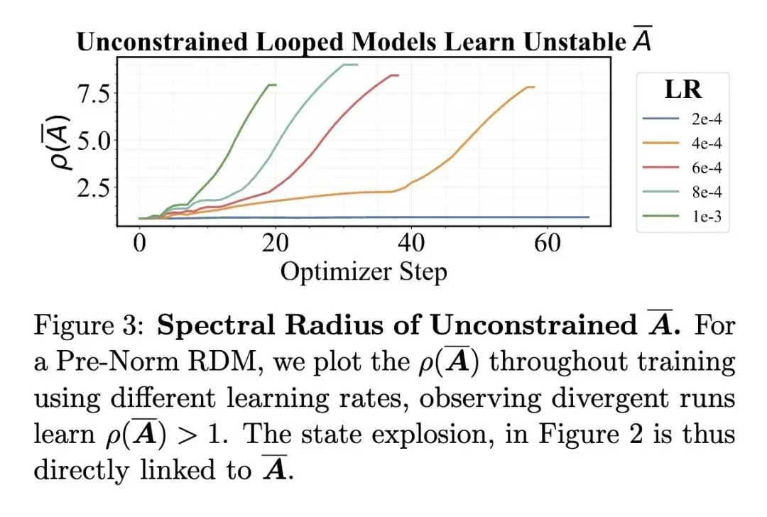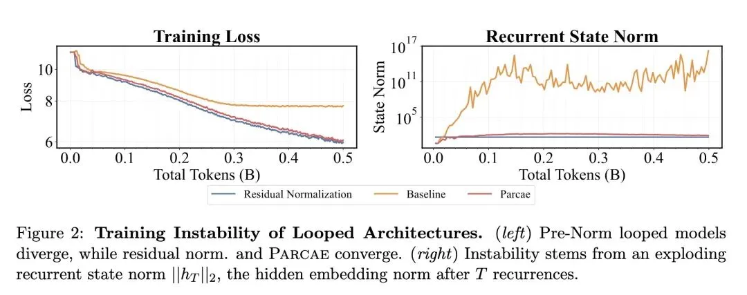 挑战了关于循环Transformer训练不稳定性(状态爆炸)源于复杂的非线性模块(注意力机制、MLP)的直觉假设;相反,它精确指出线性的输入注入参数才是罪魁祸首。 将循环架构重构为残差流上的离散线性时不变(LTI)动力系统,将经典的控制理论成功应用于神经网络分析。 发现先前的循环模型在隐式地学习不稳定的参数化,其转移矩阵的谱范数 ,从而导致了残差爆炸。 提出了Parcae模型,通过将转移矩阵参数化为负对角矩阵,强制其谱范数 ,从结构上保证了稳定性。 打破了循环模型具有“无限测试时计算扩展(Test-time Compute Scaling)”的迷思。它在数学上证明了,在推理时运行更多的循环会产生收益递减,遵循可预测的、逐渐饱和的指数衰减规律。 揭示了测试时的性能上限受到模型在预训练期间接触的循环深度()的严格限制。 确立了“循环(Looping)”与数据量、参数量一样,是一个一等、正交的扩展维度(Scaling Axis)。在固定FLOPs预算下的最优训练,需要根据精确的幂律同步扩展数据量和循环深度。 实证证明了1.3B参数的Parcae模型可以媲美2.6B参数的传统固定深度Transformer的下游任务质量,实际上将所需的内存占用减半。 解决训练损失尖峰的方法不是修改架构,而是将每个微批次(per-micro-batch)的深度采样改为每个序列(per-sequence)的深度采样,从而更好地逼近随机深度的期望值。