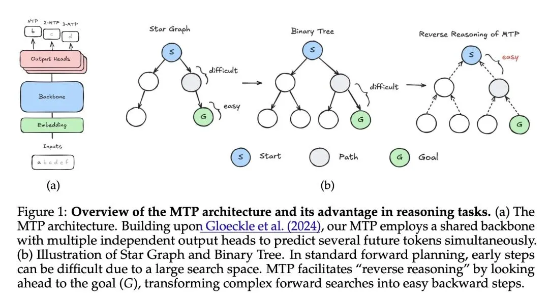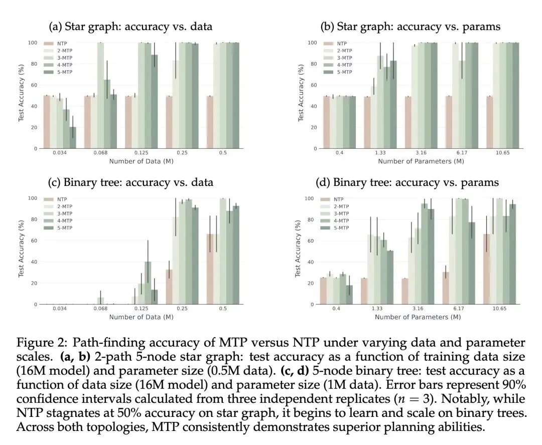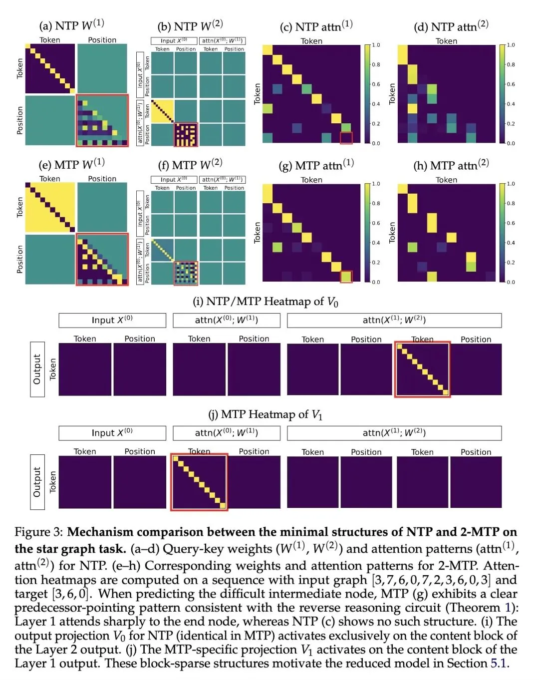 理论贡献:证明了MTP能诱导出“关注终点-- 实证贡献:在星形图(Star graph)和二叉树图任务中,通过控制变量证实了MTP不仅仅是消除了数据的捷径(聪明汉斯作弊),而且真正习得了更强的规划能力;同时在Countdown(算24点变体)和3-SAT等真实且复杂的NP-Complete推理任务上验证了MTP架构的明显优势。 机制解释:为目前工业界前沿大模型(如DeepSeek-V3等)广泛采用MTP架构提供了坚实的机理层面的理论背书。