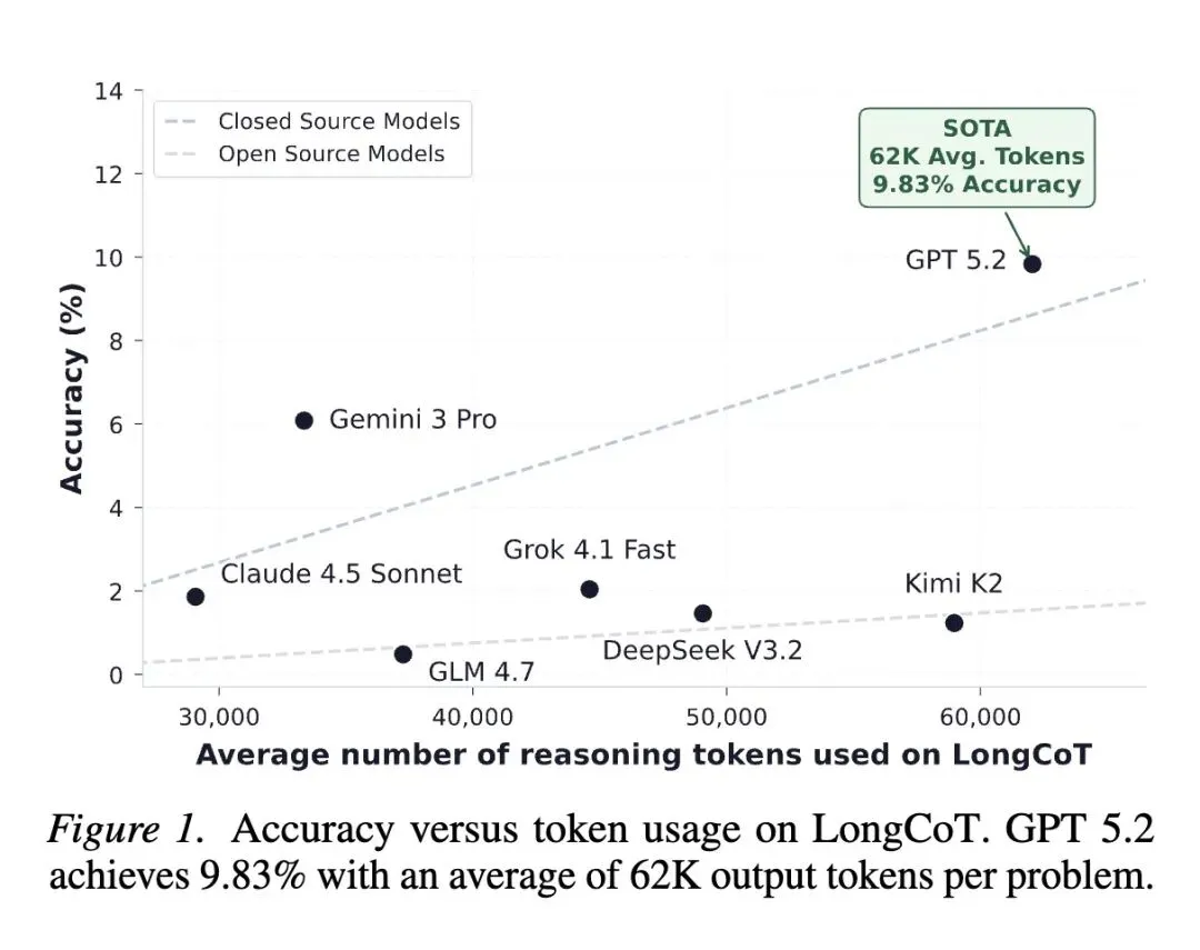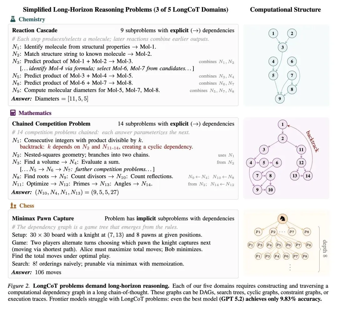 指出了当前大模型基准测试的一个关键盲区:现有的评估要么测试短链推理,要么测试Agent工作流(严重依赖工具使用和外部脚手架),未能衡量模型维持连贯的、长周期思维链(Long-Horizon CoT)的内在能力。 推出了 LongCoT,一个包含2500个可验证问题的严苛基准测试,涵盖5个截然不同的领域(化学、数学、计算机科学、国际象棋、逻辑)。 反直觉的设计: 题目的难度并不来自于冷门知识或极难的原子步骤。单个子问题对前沿模型来说很容易解决。极端的难度完全来自于复杂的图结构依赖(有向无环图、博弈树、循环约束),这需要模型生成数万到数十万个推理Token来导航。 严格在无工具环境(不允许执行代码)下运行,以剥离外部干扰,纯粹衡量基础推理能力:上下文管理、长期规划、约束传播和回溯纠错。 采用专家设计的参数化模板(显式/组合式 和 隐式/过程式),既能实现问题的大规模程序化生成,又能有效防止训练数据污染。 令人震惊的结果: 前沿模型在LongCoT上遭遇滑铁卢。最强的闭源模型 GPT 5.2 仅取得 9.83% 的准确率(尽管其每题平均输出高达6.2万个推理Token)。Gemini 3 Pro得分为6.08%,Claude 4.5 Sonnet仅为2.04%。开源模型得分几乎为零。 构建了 LongCoT-mini(500个较简单的问题),成功用于区分开源模型的能力(例如,DeepSeek V3.2在此子集上达到8.3%,Kimi K2达到7.5%)。 高信息熵发现: 随着问题长度增加,模型性能的下降幅度远大于独立误差累乘的数学期望。这证明了模型的失败是结构性的(状态丢失、无法回溯),而不仅仅是随机的局部错误。 证实了如递归语言模型(RLMs)等先进的Agent脚手架在纯长程推理任务上失效,因为图结构依赖无法被干净地分解或折叠,强行分解会导致关键状态丢失。
