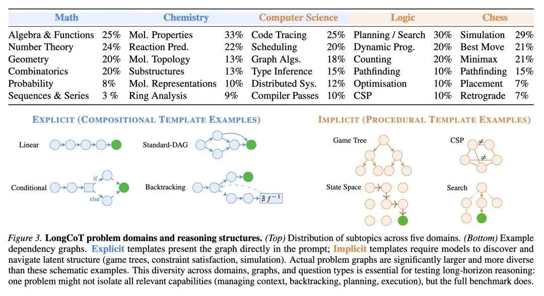 能力剥离与极限施压: 首次明确区分了“Agent工具使用能力”与“模型内生长程推理能力”,通过禁止代码执行,迫使模型只能通过其内部的思维链(CoT)来承载巨大的依赖结构计算负担。 图依赖难度的参数化构造: 摒弃了依靠“单步超难”来难倒模型的传统做法,创新性地采用“原子步骤简单,全局图结构复杂”的范式。通过显式(如DAG组合)和隐式(如博弈树搜索)的专家参数化模板,实现了长程推理难度的精准和可扩展控制。 反解耦验证范式: 针对近期流行的上下文折叠和多Agent协作架构(如RLM),LongCoT通过高度交织的任务状态设计,专门击穿了这些试图走捷径的框架,确保测试的是真正的全局连贯推理。