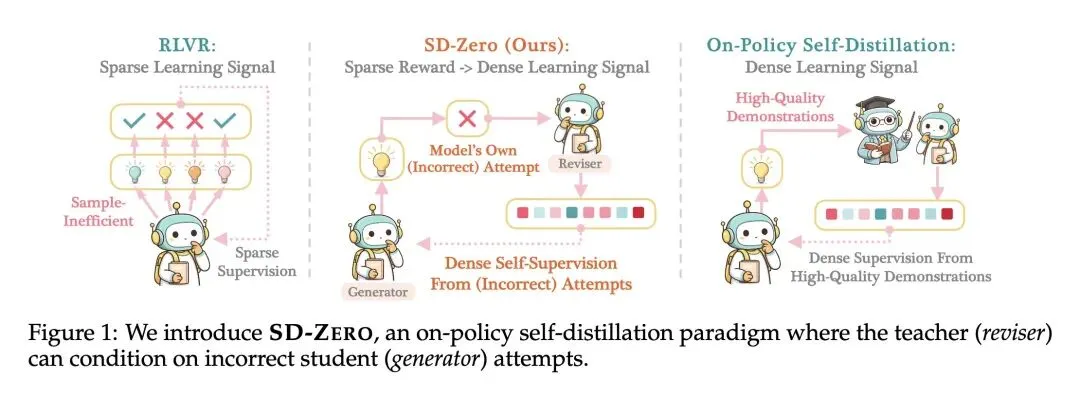 Current post-training methods in verifiable settings fall into two categories. Reinforcement learning (RLVR) relies on binary rewards, which are broadly applicable and powerful, but provide only sparse supervision during training. Distillation provides dense token-level supervision, typically obtained from an external teacher or using high-quality demonstrations. Collecting such supervision can be costly or unavailable. We propose Self-Distillation Zero (SD-ZERO), a method that is substantially more training sampleefficient than RL and doesn’t require an external teacher or high-quality demonstrations. SD-ZERO trains a single model to play two roles: a Generator, which produces an initial response, and a Reviser, which conditions on that response and its binary reward to produce an improved response. We then perform on-policy self-distillation to distill the reviser into the generator, using the reviser’s token distributions conditioned on the generator’s response and its reward as supervision. In effect, SD-ZERO trains the model to transform binary rewards into dense token-level self-supervision. On math and code reasoning benchmarks with Qwen3-4B-Instruct and Olmo-3-7B-Instruct, SD-ZERO improves performance by at least 10% over the base models and outperforms strong baselines, including Rejection Fine-Tuning (RFT), GRPO, and Self-Distillation Fine-Tuning (SDFT), under the same question set and training sample budget. Extensive ablation studies show two novel characteristics of our proposed algorithm: (a) token-level self-localization, where the reviser can identify the key tokens that need to be revised in the generator’s response based on reward, and (b) iterative self-evolution, where the improving ability to revise answers can be distilled back into generation performance with regular teacher synchronization. SampleInefficient Sparse Supervision Dense Self-Supervision From (Incorrect) Attempts RLVR: Sparse Learning Signal SD-Zero (Ours): Sparse Reward -> Dense Learning Signal High-Quality Demonstrations Dense Supervision From High-Quality Demonstrations On-Policy Self-Distillation: Dense Learning Signal Generator Reviser Model’s Own (Incorrect) Attempt Figure 1: We introduce SD-ZERO, an on-policy self-distillation paradigm where the teacher (reviser) can condition on incorrect student (generator) attempts.