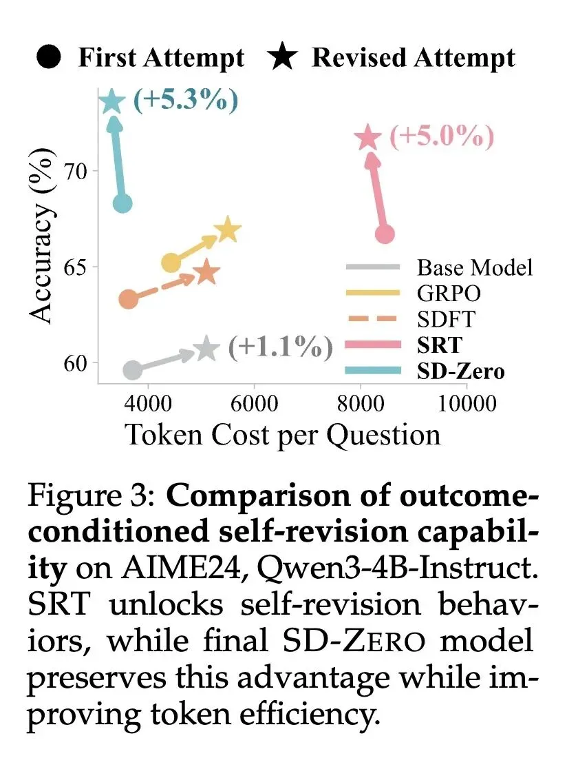 提出了一种极具样本效率的后训练方法SD-ZERO,在同等数据预算下,大幅超越了RFT、GRPO和传统SDFT等主流方法。 证明了LLM具备内在的“Token级自我定位”能力,即仅凭最终结果的对错,模型就能在分布层面上准确定位到推理链条断裂的具体词元。 验证了“迭代自我进化”的可行性:证明了通过不断同步教师模型权重(Teacher Synchronization),无需外部数据即可实现多轮次的自我提升。