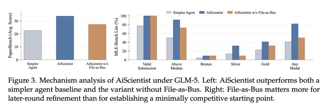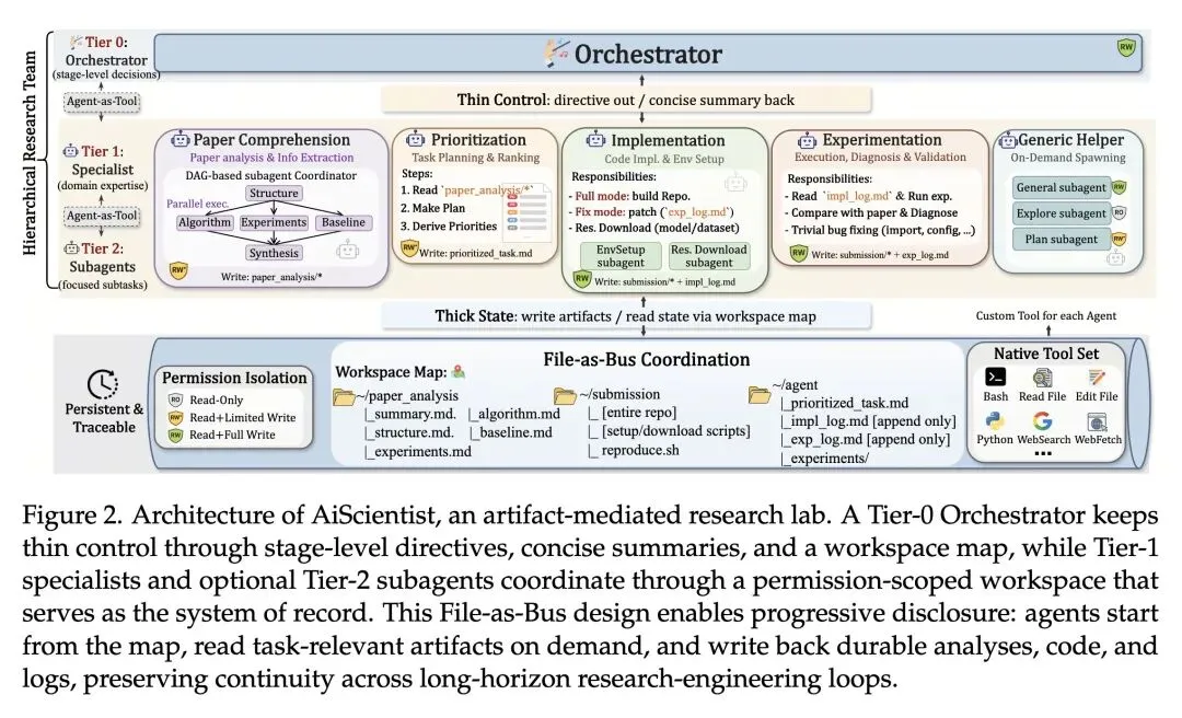 挑战了多智能体系统中“增加对话交互和推理就能带来更好结果”的普遍假设。文章证明,在长周期任务中,依赖对话式交接会导致灾难性的上下文丢失和幻觉。 提出了极其反直觉但高效的“厚状态上的薄控制(Thin Control over Thick State)”设计范式。顶层编排器(Orchestrator)不再将繁杂的项目历史塞满上下文窗口,而是仅保留紧凑的“工作区地图”和简明摘要(薄控制),实际数据则持久化在文件系统中(厚状态)。 提出了“文件即总线(File-as-Bus)”协调协议。智能体之间不通过聊天进行通信和状态保持,而是在权限隔离的共享工作区中读写持久化制品(如日志、代码、数据),将文件系统作为“单一事实来源(System of Record)”。 使用“智能体即工具(Agent-as-Tool)”机制重构了多智能体委派。专家智能体(Tier-1)被视为标准工具(如同Python执行或网页搜索),由编排器按需调用,使得任务委派变得灵活可选,而非僵化的流水线。 高信息熵发现:消融实验揭示,“文件即总线”协议对于后期的迭代优化(调试和指标提升)比对于构建初始可运行代码更加至关重要。移除该机制会导致在MLE-Bench Lite上的“任意奖牌率”暴跌31.82个百分点。 展现了巨大的效率提升:AiScientist在PaperBench上大幅击败了重度交互的基线(如IterativeAgent),同时将推理成本降低了高达77%(例如在GLM-5下,单任务成本从12.20)。 得出一个根本性结论:自主长周期机器学习研究本质上是一个系统工程问题(在持久状态上协调专业工作),而不仅仅是一个大模型局部推理问题。
