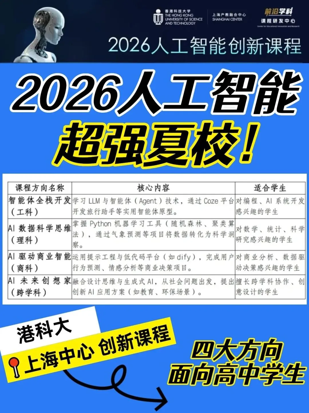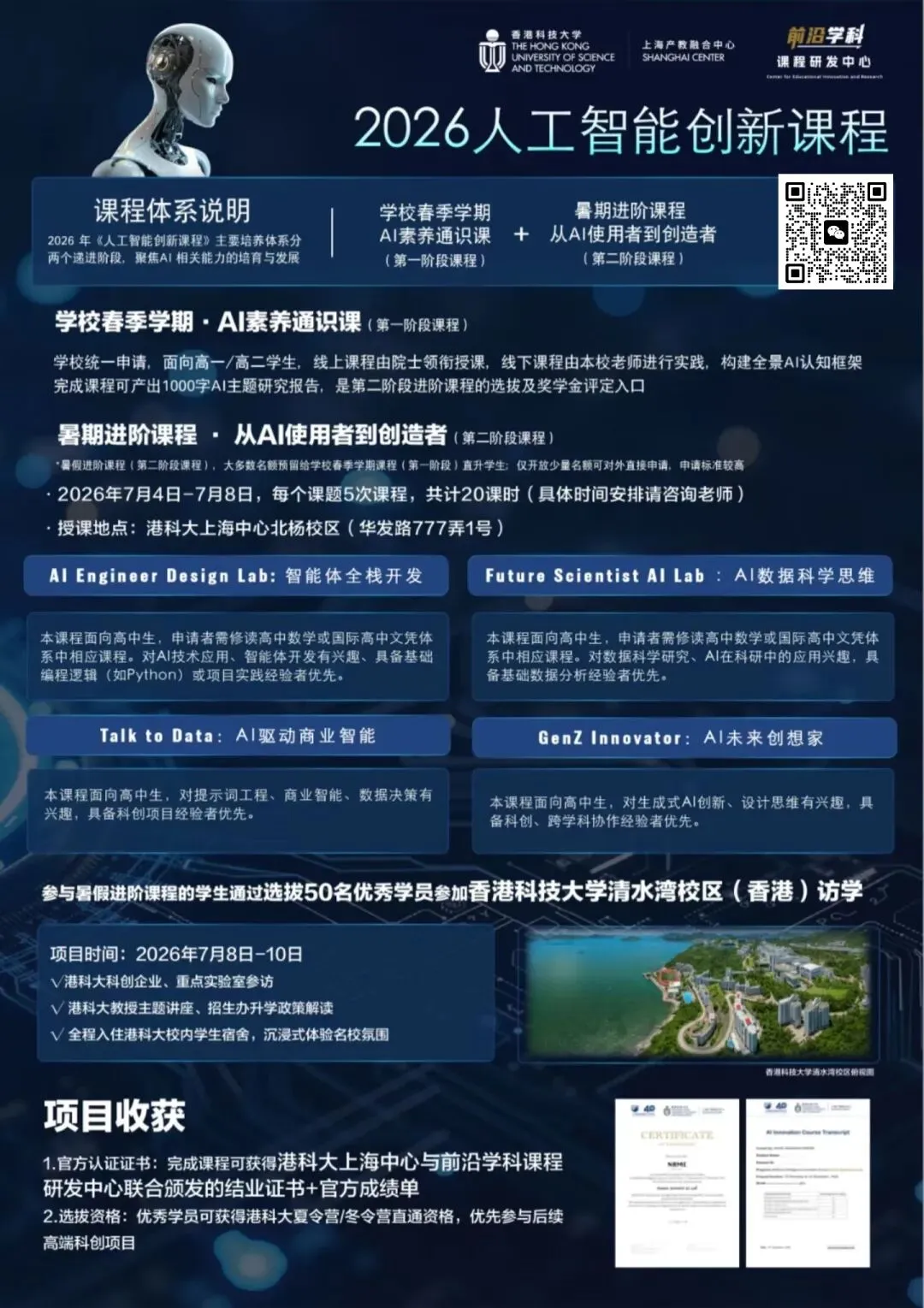 暑期疯抢!2026 AI人工智能夏校!继寒假期间成功举办【AI 创新课程】之后,应广大学生家长要求,香港科技大学上海中心又推出了夏校课程,而且本次全面升级,更多亮点值得关注!🔥【2026人工智能创新暑期课程】依托港科大资源打造,面向高中生提供系统化AI进阶路径!今年暑期5天沉浸式学习,覆盖技术实践与跨学科应用,更设有50人港科大香港清水湾校区访学机会,直连真实科研环境。👨🎓✅课程全览本进阶课程依托港科大顶尖学术资源,定位 “从使用者到创造者” 的能力晋升阶段,采用项目式学习(PBL)模式,分设🔹理、🔹工、🔹商、🔹跨学科四大专题方向,实现 “AI + 学科” 的深度融合,培养工程化实战、科学研究与跨学科创新能力。✅课程学习时间2026年7月4日至7月8日,共计5天,每天安排系统化课程与项目实践,总计20课时。✅授课地点位于港科大上海中心🎯,采用小班制与项目制结合,确保学习质量与参与深度。✅整体内容围绕AI核心能力展开,学生将在真实问题驱动下理解技术逻辑,并逐步形成系统认知,实现从入门到进阶的跨越。🥇访学机会完成课程后,项目将选拔50名优秀学员,于2026年7月8日至10日前往港科大清水湾校区进行访学。学习结束即衔接访学,形成完整闭环体验。🥇完成课程后,学生将获得由港科大上海中心与课程研发中心联合颁发的证书及成绩单,可作为升学材料的重要补充。在AI竞争加速的当下,这不仅是一门课程,更是一场能力跃迁的起点❗❗❗🚩因为小班制,本次AI创新课程营的名额非常有限!我们建议有意向的同学和家长扫码尽早锁定席位🙋♂️