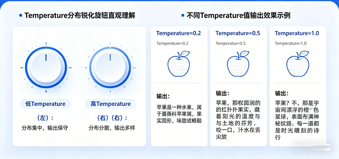 Temperature 是一个大于0的数值,通常范围在 0~2 之间。它通过调整概率分布的“陡峭程度”来控制随机性: