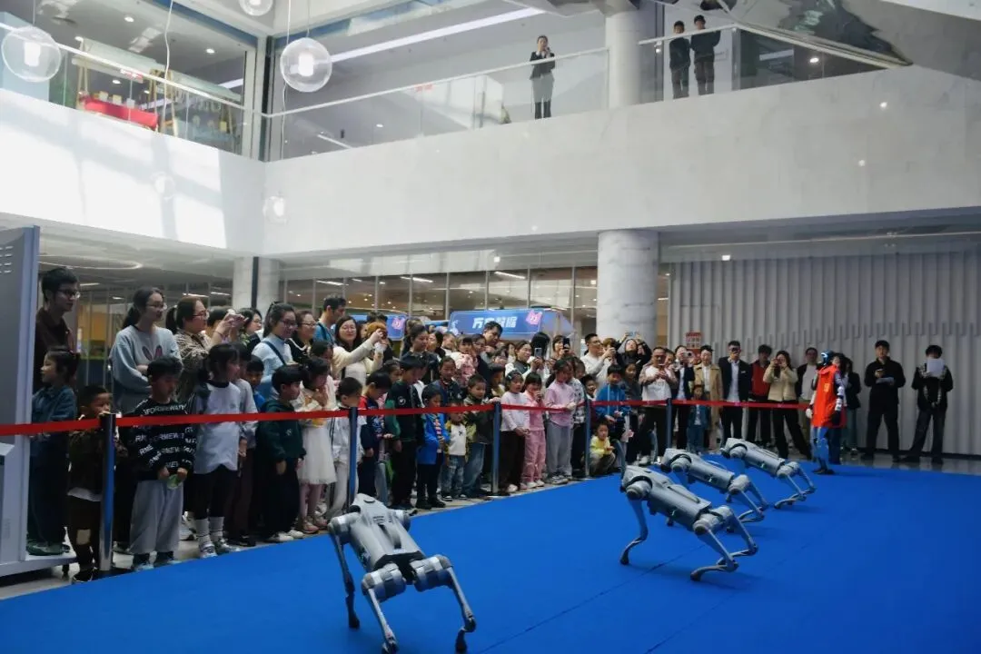 活动现场,科技感与文化味交相辉映。当天上午,吴兴区图书馆一楼中庭,机器狗编队以整齐的翻滚、跳跃展现前沿科技魅力;人形机器人则灵活互动,通过语音揭榜及武术功夫秀点燃现场气氛。在核心的AI智慧伴读环节,机器人化身“AI小书童”,为少儿读者生动讲述绘本故事,实现了科技与阅读的亲密融合。当天下午,活动主场地转移至湖州浙北大厦购物中心。机器人军团再次登场,带来功夫秀、互动体验、巡游派礼等精彩环节,吸引大量商场顾客驻足参与。