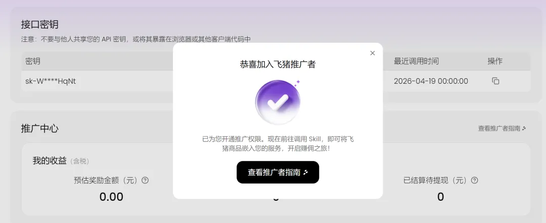 据官网信息,飞猪AI开放平台还同步上线“推广者计划”,当有消费者使用开发者基于“flyai”skill的AI工具或应用下单相应旅行商品时,开发者即可获得佣金。这打通了出行类AI应用的后端开发和前端应用的价值链路,是AI时代旅行数据从“沉默资产”到“生产资料”的关键一跃。