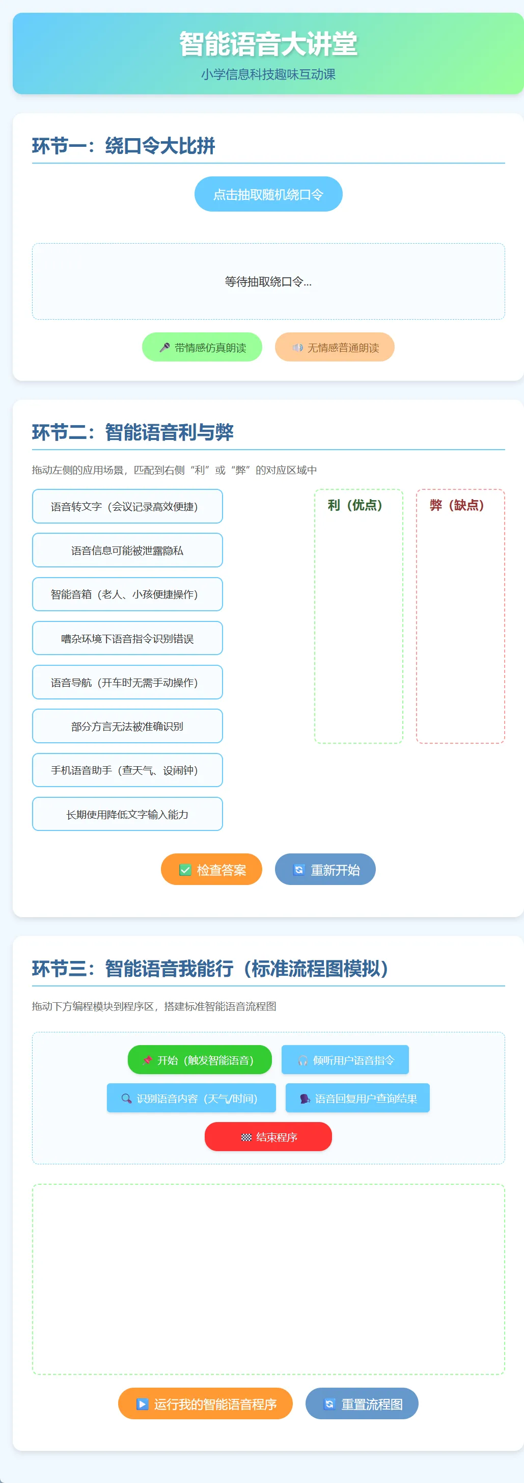 《智能语音大讲堂》是一款互动性强、逻辑清晰的AI启蒙课件,通过绕口令体验、拖拽辨析、模块搭建等多元形式,帮助小学高年级学生在趣味探究中理解智能语音“倾听—识别—回复”的核心逻辑,培养辩证看待技术的能力与初步的计算思维。无论是新课导入还是复习巩固,它都能成为学生了解智能语音的实用工具!