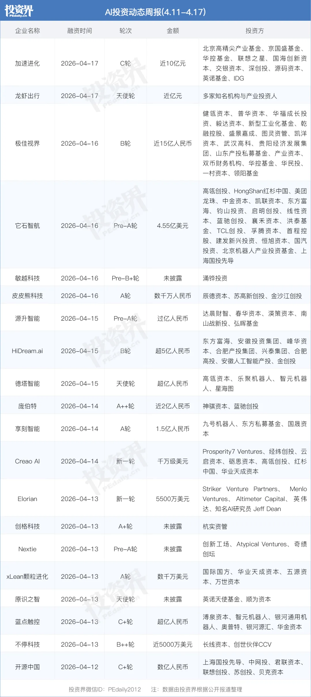 投资方:健瓴资本,普华资本,华福成长投资,毅达资本,新型工业化基金,乾融控股,盛景嘉成,图灵资管,凯洋资本,武汉高科,贵阳经济发展集团,山东产投私募基金,产业资本,双币财务机构,华控基金,华民投,一村资本,领阳基金