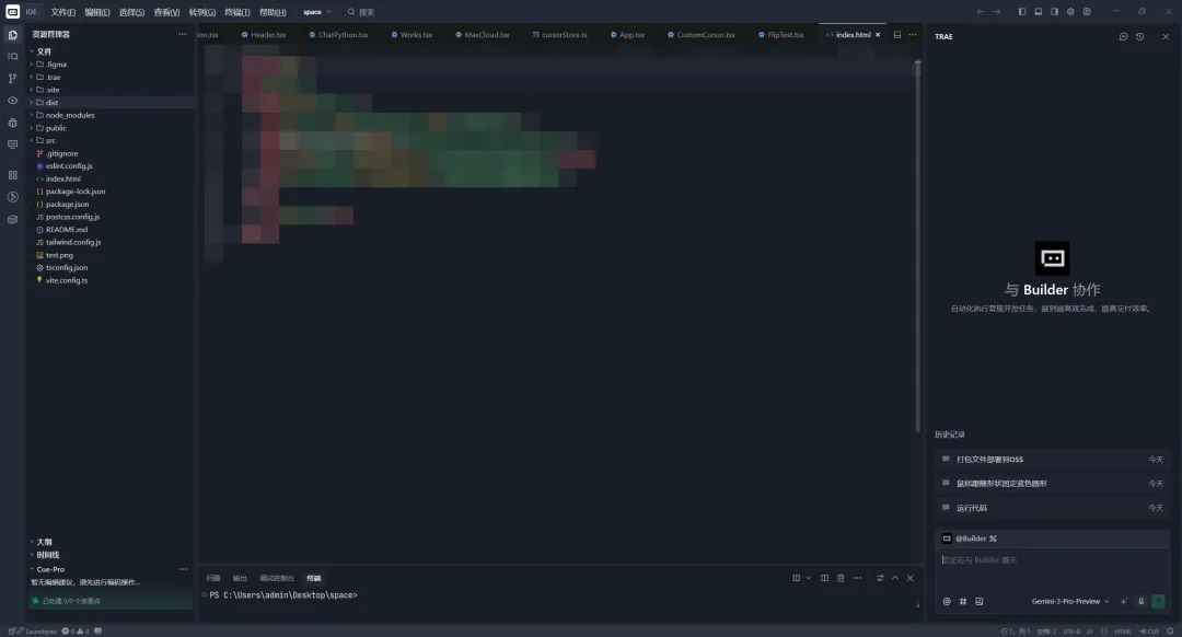 下面就是搭建框架了,如果你是一个有一定的开发基础的人,你完全可以利用 IDE 模式来独立完成这一步。但如果你是一个完全不了解的人(像我一样),那我建议这里使用 TRAE solo 模式(其他 IDE 工具都有类似的功能,例如 Qoder 的 Quest 模式等等)来实现第一个页面,这里我们要的是基础框架的代码文件,因此无所谓它是否需要还原设计文件,因此这一步,我们要做的很简单,只需要跟 AI 说明我们要做一个个人网站即可。
