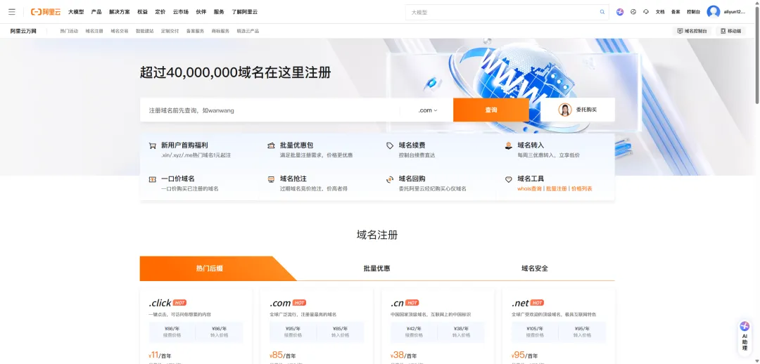 想要购买域名你可以直接前往阿里云、腾讯云等云服务产品官网,直接搜索“域名”即可,例如下图就是阿里云的域名购买页面。