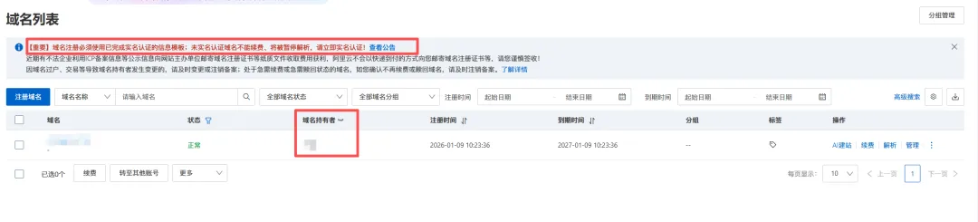 国内要求域名必须要进行实名认证,这里就是要填写一些个人信息然后认证,通常一天内绝对可以完成。
