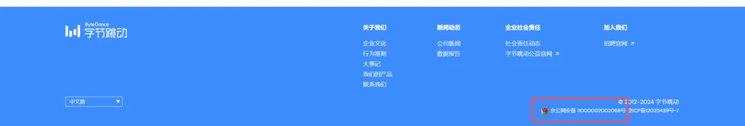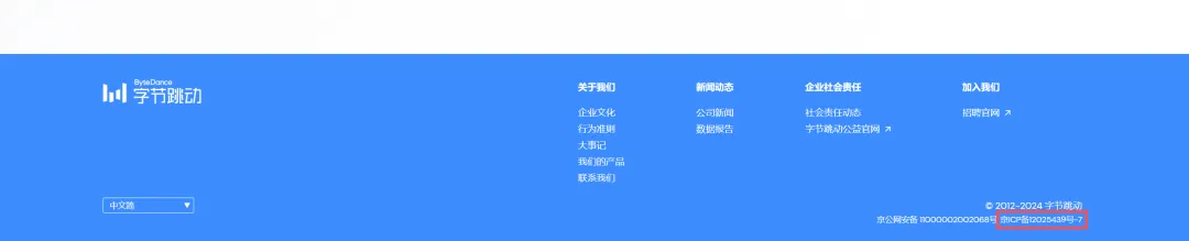 这时候你会获得一个重要的信息,网站备案号,就是你在每一个国内网站的页脚会看到的,例如下图字节跳动官网页脚: