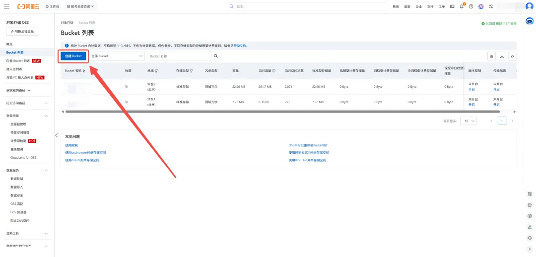 首先你需要搜索“阿里云OSS”打开 OSS 控制台,如果你是第一次进入,你会没有任何的数据,这时候你需要创建一个 Bucket,你需要按照如下图的形式操作。