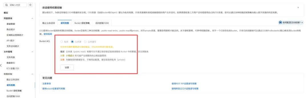然后把读写权限调整为共公共读,否则其他人无法查看你的网站。