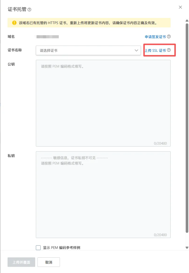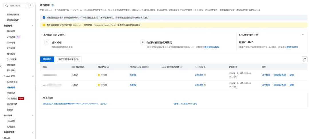 购买完即可部署,然后再回到 OSS 控制台,找到你要部署的 Bucket。如下图,你要选择你的证书,即可完成全部的内容。