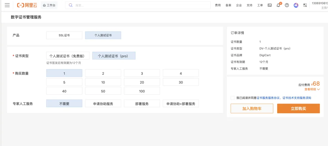 这里只需要购买测试版本证书即可,当然如果你是企业或是你有更高的要求,也可以购买专业证书,但是比较贵,最便宜的个人版本也需要几百元一年。