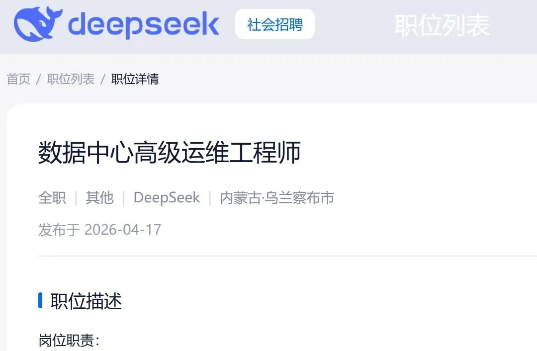 相关招聘平台信息显示,DeepSeek目前正在内蒙古乌兰察布招聘数据中心运维工程师,这是该公司首次招聘直接负责计算基础设施运营的人才,也被业内视为V4大模型已进入大规模部署阶段。