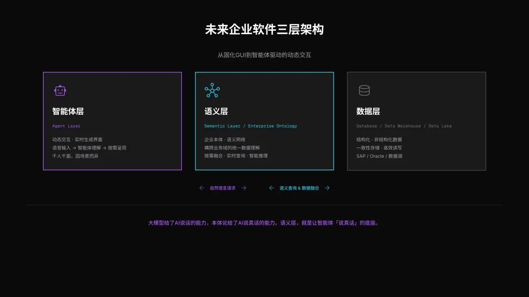 第二,开始构建企业语义层。 面向未来的软件底层,从现在就该思考:你的企业有多少数据散落在多少系统中?它们之间的业务语义关系是什么?能否建立统一的企业本体?