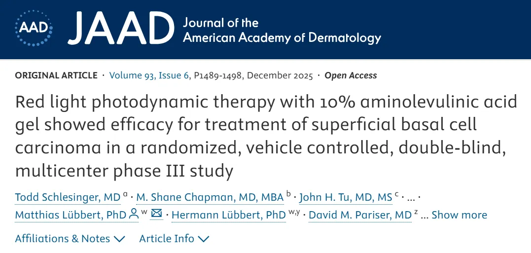 文献启迪,AI赋能!「皮外医生手记」文献推荐火热进行中,我们将精选皮外前沿文献,与大家分享交流。如需获取更多学习资源,欢迎联系小助手加入皮外社群。本期对《10%氨基酮戊酸凝胶联合红光光动力疗法在浅表型基底细胞癌治疗中的有效性》进行解读,并经四川省人民医院陈明懿教授、云娇教授审核指导,与各位同仁共同探讨。
